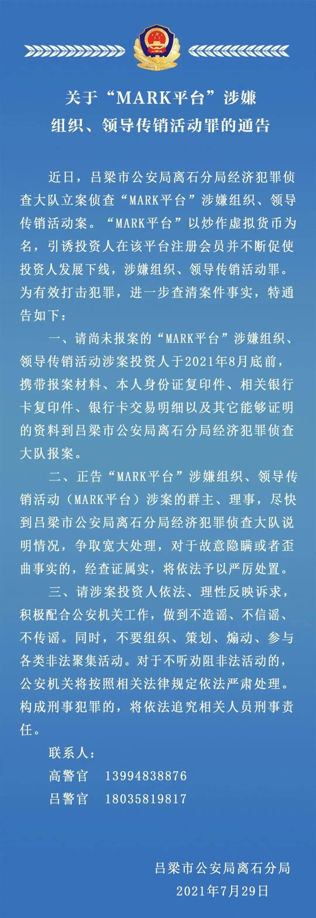 近日,吕梁市公安局离石分局经济犯罪侦查大队立案调查“MARK平台”涉嫌组织、领导传销活动案。“MARK平台”以炒作虚拟货币为名,引诱投资人在该平台注册会员并不断促使投资人发展下线,涉嫌组织、领导传销活动罪。为有效打击犯罪,进一步查清案件事实,特通告如下: