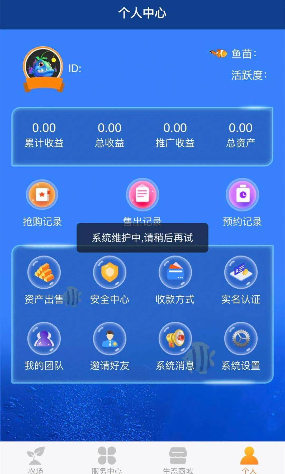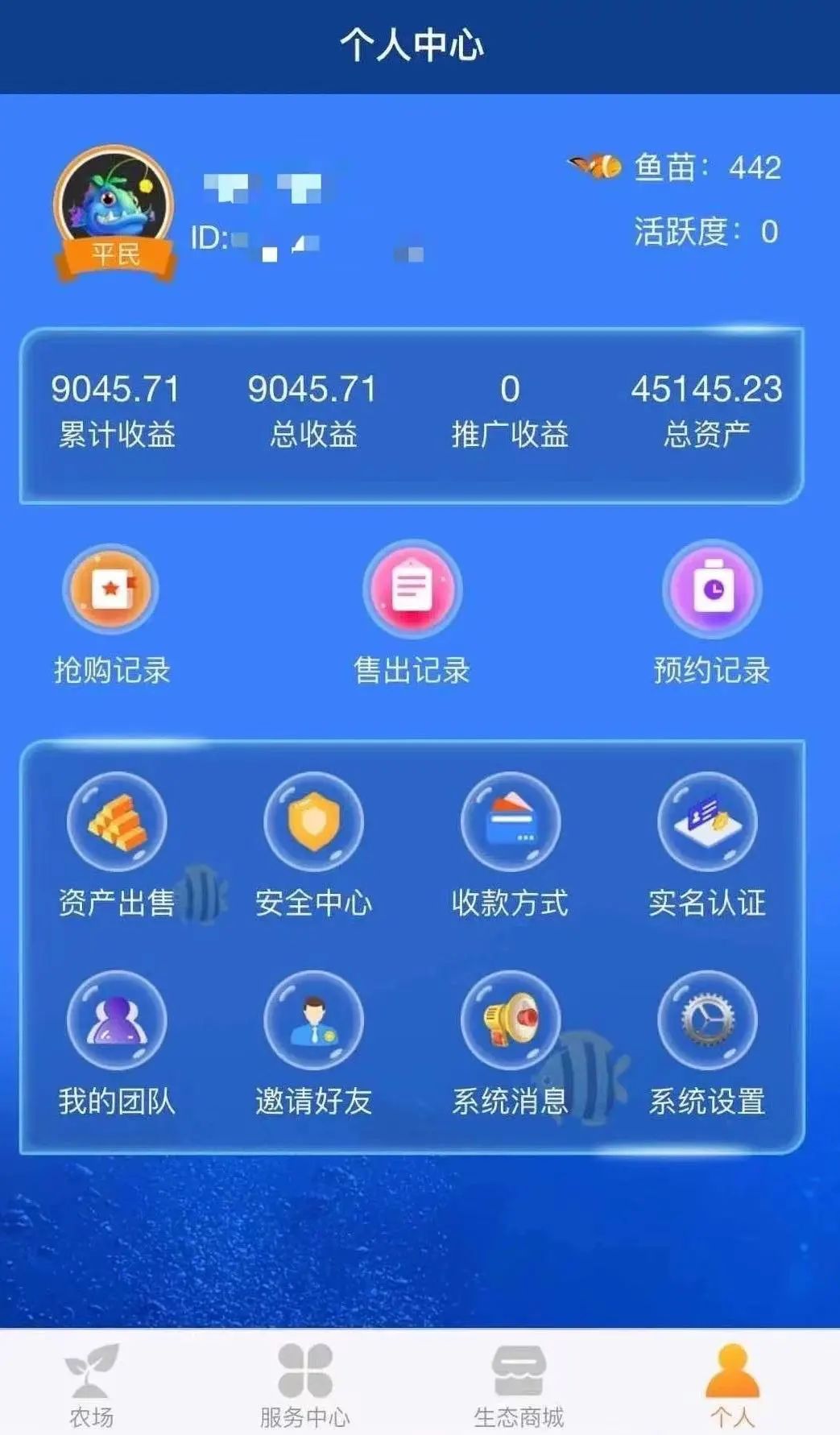 “生态农场”游戏以免费扫码下载注册成为会员(平民),实名认证,绑定收款信息(支付宝、微信、银行卡),联系推荐人或者客服充值100鱼苗激活账户(1元购买1个鱼苗),预约后准时抢购。鱼苗用来预约、抢购成鱼。