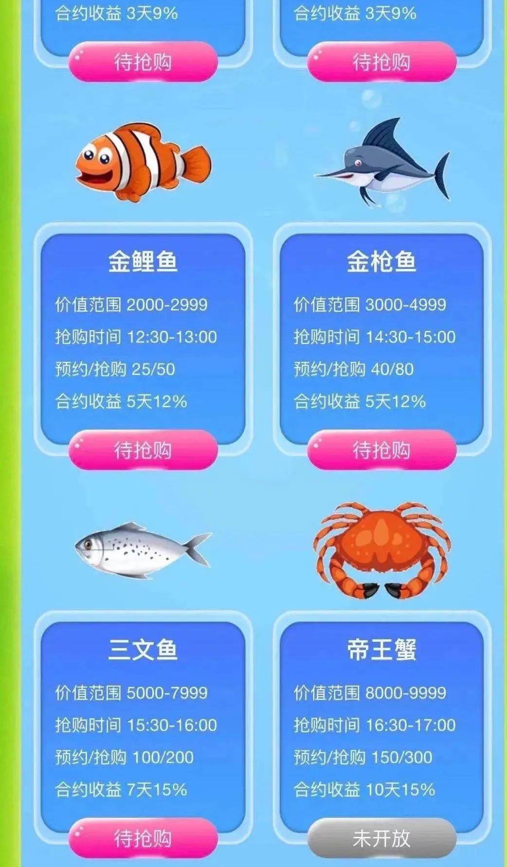 平台共有八种鱼出售,初始价格分为300元至14999元不等,在合约周期内产生5%至22%不等的收益。抢购成功后,从系统或者玩家购买相应的成鱼,通过确认微信、支付宝、银行卡等支付凭证来进行交易。系统根据鱼的种类,从玩家账户自动扣除7至800不等的鱼苗作为手续费。玩家购买成鱼后,根据成鱼的种类,会有不同的合约周期和合约收益。