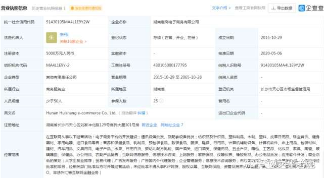 企查查显示,湖南惠商电子商务有限公司成立于2015年,位于长沙市,认缴资本5000万元,实缴0元。执行董事兼总经理朱伟,大股东为刘建中。