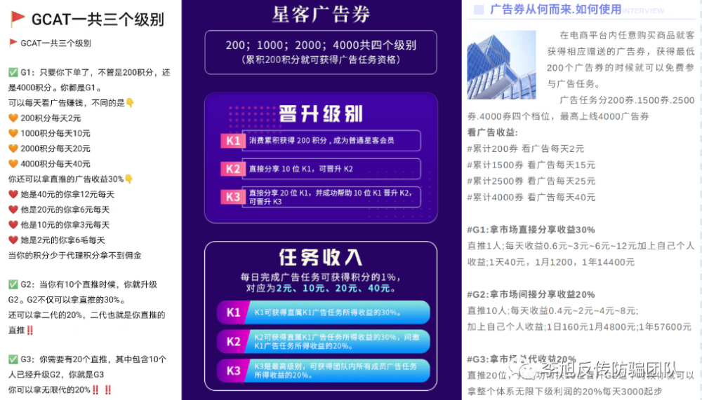 李旭反传销团队注意到,“星客电商”的运营模式与我们前期预警的“GCAT广告电商平台”模式如出一辙,都是以购物、发展下线。看广告等方式运营,包括两个平台的分红比例也一模一样。看广告可获高额收益?网友质疑“GCAT”广告电商平台涉嫌传销
