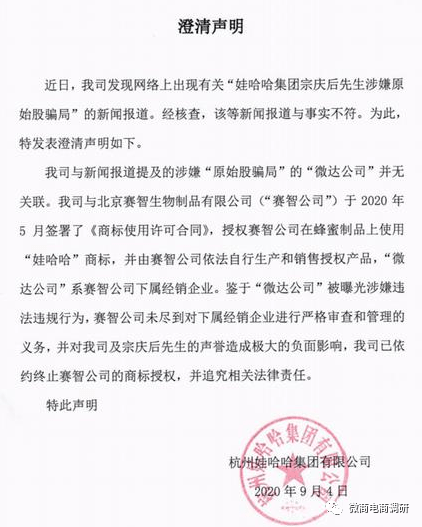 到了2020年9月4日,娃哈哈便 发布《澄清声明》,《声明》称:2020年5月,娃哈哈与北京赛智生物制品有限公司签署了《商标使用许可合同》,授权赛智公司在蜂蜜制品上使用“娃哈哈”商标,并由赛智公司依法自行生产和销售授权产品,“微达公司”系赛智公司下属经销企业。
