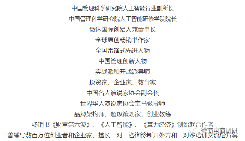 在这些头衔当中,最为耀眼的当属中国管理科学研究院旗下的所谓人工智能行业副所长和人工智能研修学院院长了,而关于中国管理科学研究院下设分支机构是不是交钱就能办,有些头衔是不是交钱合作就能拿到,微商电商调研此前曾在题为《“秒淘惠新商业研究中心”含金量几何,中管院早已负面缠身》的报道中有过提及,此处不多赘述。