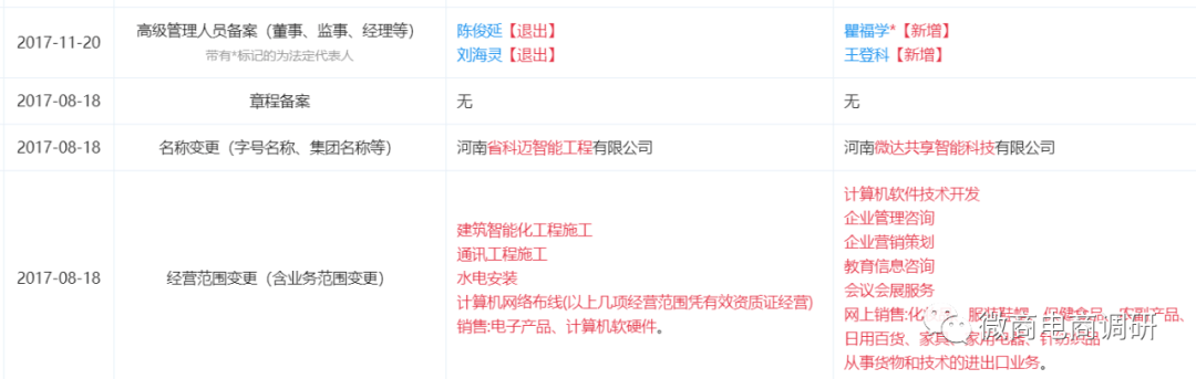 值得一提的是,虽然该公司成立已有十年之久,不过在2017年8月之前,该公司还叫河南省科迈智能工程有限公司,当时的经营范围和如今微达国际的经营范围相差悬殊,当年11月,瞿福学的名字才正式出现在该公司实控人的席位上,因此,准确来说,河南微达共享智能科技有限公司成立至今不过四年时间。眼下,瞿福学名下共有两家企业,另外一家名叫洛阳微达网络科技有限公司,该公司成立于2013年。