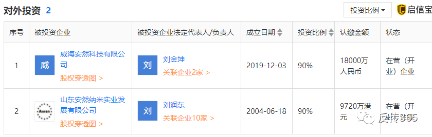 在工商信息层面,也有资料可以说明科普森和安然有关。据悉,中信(香港)国际投资有限公司共对外投资了两家公司,一家是刘润东的山东安然纳米实业发展有限公司,另一家是刘金坤的威海安然科技有限公司。