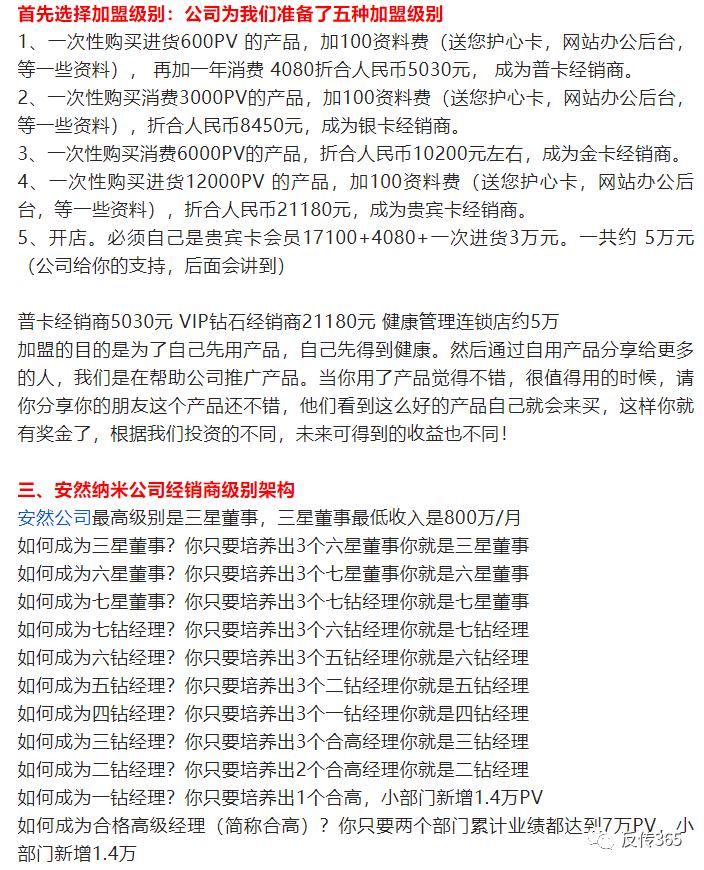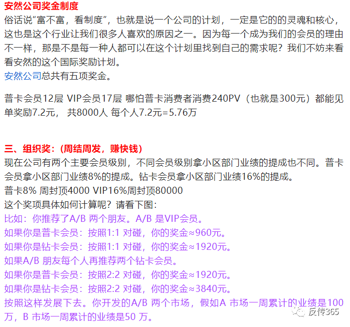 了解完肌樱的奖金制度之后,我们在此不妨再将安然纳米的直销模式与之进行对比。据公众号“某某钻石人生”介绍,安然此前实行的奖金制度如下:
