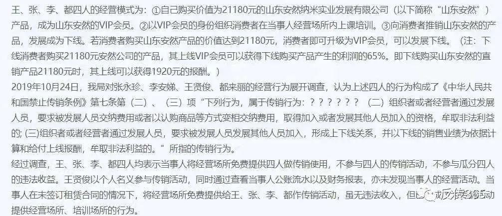 据该行政处罚决定书披露,涉案人采用的经营模式为:①自己购买价值为21180元的山东安然纳米实业发展有限公司产品,成为山东安然的VIP会员。②以VIP会员的身份组织消费者在当事人经营场所内上课培训。③向消费者推销山东安然的产品,发展成为下线。若消费者购买山东安然产品的价值达到21180元,消费者即可升级为VIP会员,可以发展下线。(注:下线消费者购买21180元安然公司的产品,其上线VIP会员可以获得下线购买产品产生的利润的65%。即下线购买山东安然的直销产品21180元时,其上线可以获得1920元的报酬。而这样的经营行为,被安吉县市场监督管理局认定为属于传销行为。