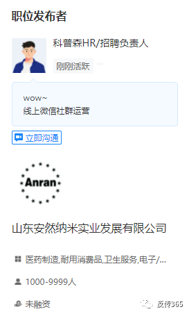 有意思的是,发布招聘消息的单位是安然公司,但HR却是科普森的HR,工作地址(广州市黄埔区坑田大街32号鱼珠智谷E-PARK创意园B20号)也就是科普森公司的注册地址。