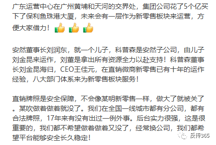 关于科普森和安然的关系,经销商阿青(化名)是如此表述的:科普森是安然的子公司,科普森新零售也是安然董事长的儿子在操盘(还有人在聊天记录中指出安然董事长刘润东的儿子就是刘金坤),归根结底,无论是公司还是操盘手,科普森和安然都是子与父的关系。此外,在阿青看来,安然的直销牌照也是为科普森新零售护航的关键因素之一,虽然按照她的说法来看,科普森不是直销模式,只是安然另设的新零售板块而已。