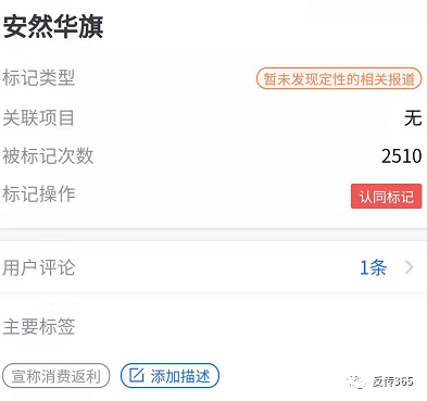 另外值得一提的是,“安然华旗”已被标记2510次,主要标签有“宣称消费返利”的字样。