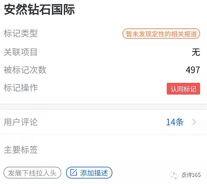 “安然钻石国际”则已被标记了497次,主要标签有“发展下线拉人头”的字样。