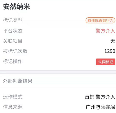 眼下,在腾讯灵鲲金融风险监管平台上,“安然纳米”这个关键词已被标记了1290次,标记类型为“有违规直销行为”,平台状态为“警方介入”。