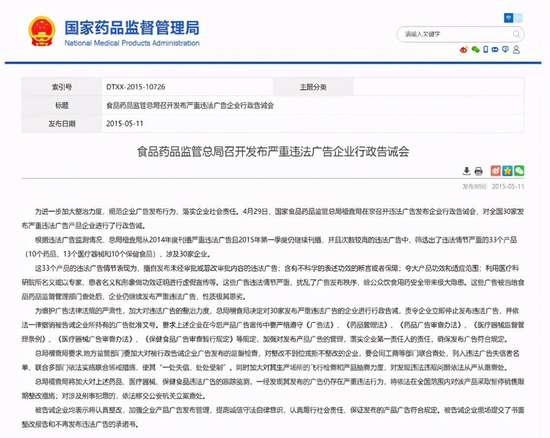 违规代言、虚假宣传,2015年被国家食药监局稽查局行政告诫