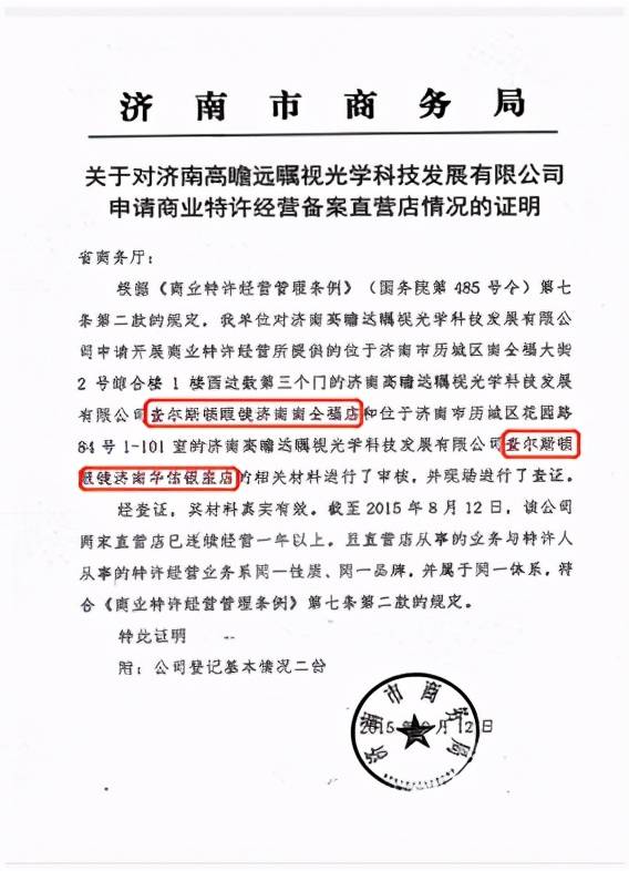 在商务部政府信息公开告知书[商公开字(2020)18号]中显示2015年8月12日济南市商务局关于对济南高瞻远瞩视光学科技发展有限公司申请商业特许经营备案直营店情况的证明里,“两店”分别是查尔斯顿眼镜济南南全福店和查尔斯顿眼镜济南华信银座店。且声明“直营店从事的业务与特许人从事的特许经营业务系同一性质、同一品牌,并属于同一体系,符合《商业特许经营管理条例》第七条第二款的规定”。