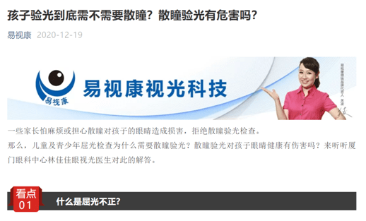 有意思的是在“易视康”的微信公众号中,2020年12月19日一篇标题为“孩子验光到底需不需要散瞳?散瞳验光有危害吗?”的文章援引厦门眼科中心林佳佳医生的解答称:“儿童及青少年的眼睛调节力很强,如果不散瞳,很容易出现近视度数配的过高,使不用配镜的假性近视也错配了眼睛。散瞳能使睫状肌麻痹调节完全放松,此时进行验光,能更加准确、客观地反映出眼睛真实的屈光性质和度数”。