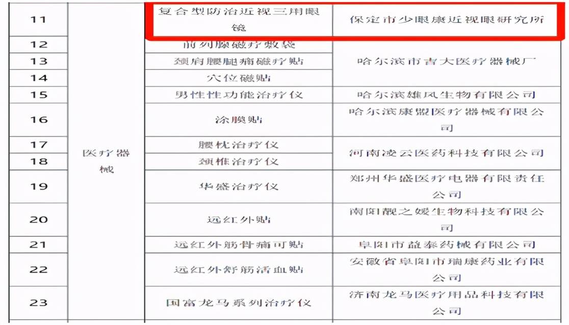 其中保定市少眼康近视眼研究所研发的复合型防治近视三用眼镜排名33个违法广告中医疗器械类榜首。