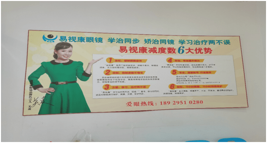 3月3日,记者来到位于衡水市桃城区永安西路与庆丰北街交叉路口的易视康衡水总店。只见店内墙壁两边用大篇幅的文字写着“中国专利一副真正控制度数增长减少近视度数的眼睛(镜)、中国近视眼预防治疗第一品牌”字样。