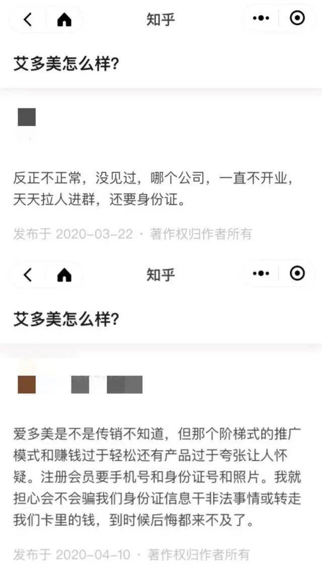 知乎平台也有不少网友表示:“是不是传销不知道,但那个阶梯式的推广模式和赚钱过于轻松还有产品过于夸张让人怀疑。注册会员要手机号和身份证号和照片,我担心会不会骗我们身份证信息干非法事情…”“反正不正常,没见过那个公司一直不开业,天天拉人进群,还要身份证。”