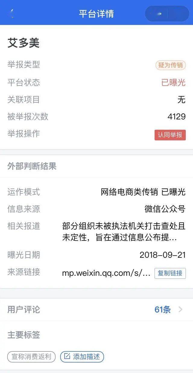 截至8月4日,腾讯灵鲲金融风险查询举报平台上显示,目前对艾多美涉嫌传销的标记举报已经高达4129条,关于运作模式为“网络电商类传销 已曝光”。