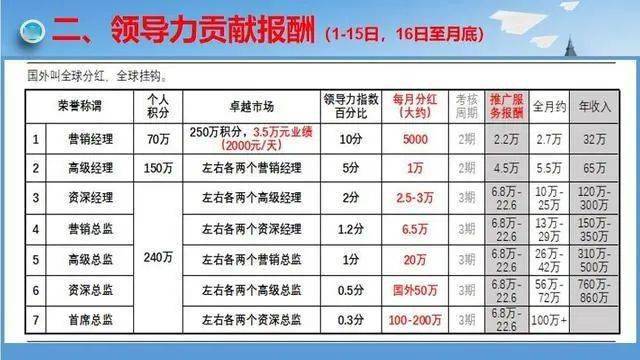 此外,还有菁英成长奖和服务中心报酬。虽然表格内给出了现金、产品、海外游、车补等福利,但还是不难忽略要达到这些等级需要付出的成本。