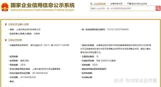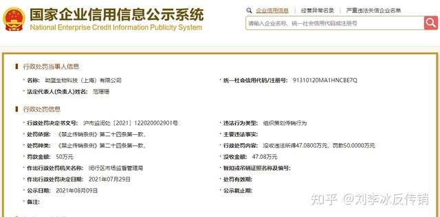 近日,刘李冰反传销团队讯:日前,北青网健康在国家企业信用信息公示系统上注意到一则行政处罚书,显示呦蓝生物科技(上海)有限公司因涉嫌传销被上海市闵行区市场监督管理局罚没资金97万余元。