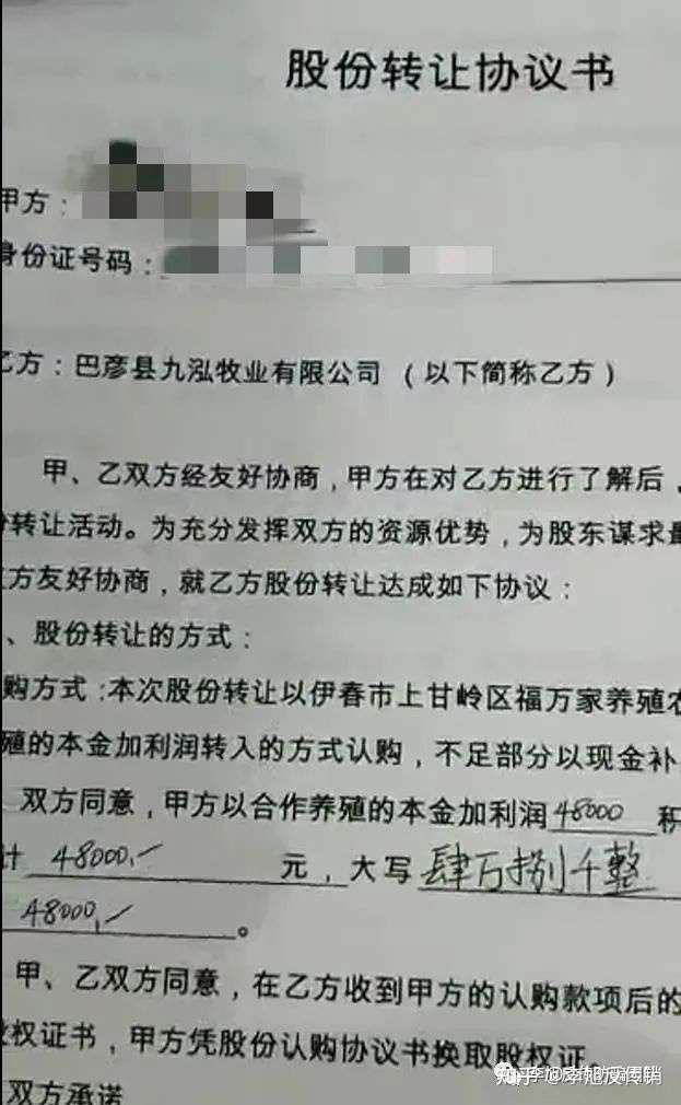 合同内容提到,认购方式,本次股份转让以伊春市上甘岭区福万家养殖农民专业合作社养殖的本金加利润转入的方式认购,不足部分以现金补足。实则就是变相圈钱。