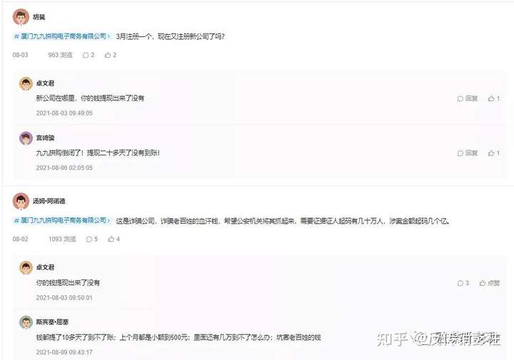 融媒新发现还注意到,在企查查讨论区,不少网友纷纷发表对“九九拼购”的看法,其中主要反映的问题是:“提现难”、“客服无法联系”等问题。