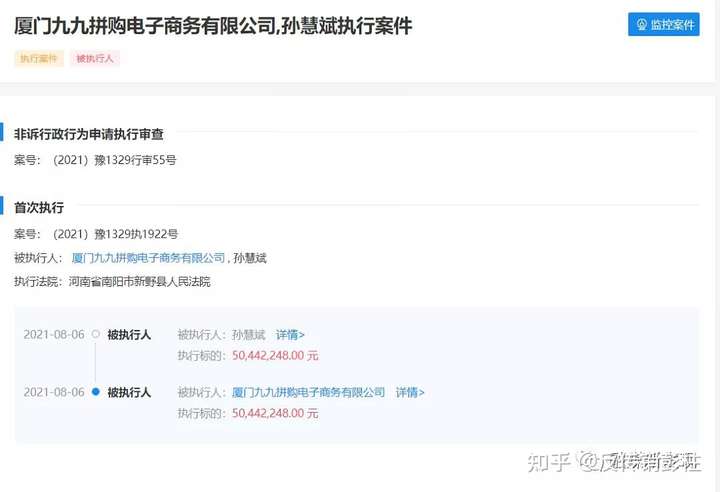 近日,企查查公布了一起司法案件,据(2021)豫1329行审55号显示,厦门九九拼购电子商务有限公司与法人孙慧斌被列入被执行人,执行标的:50,442,248.00元。执行法院是河南省南阳市新野县人民法院。