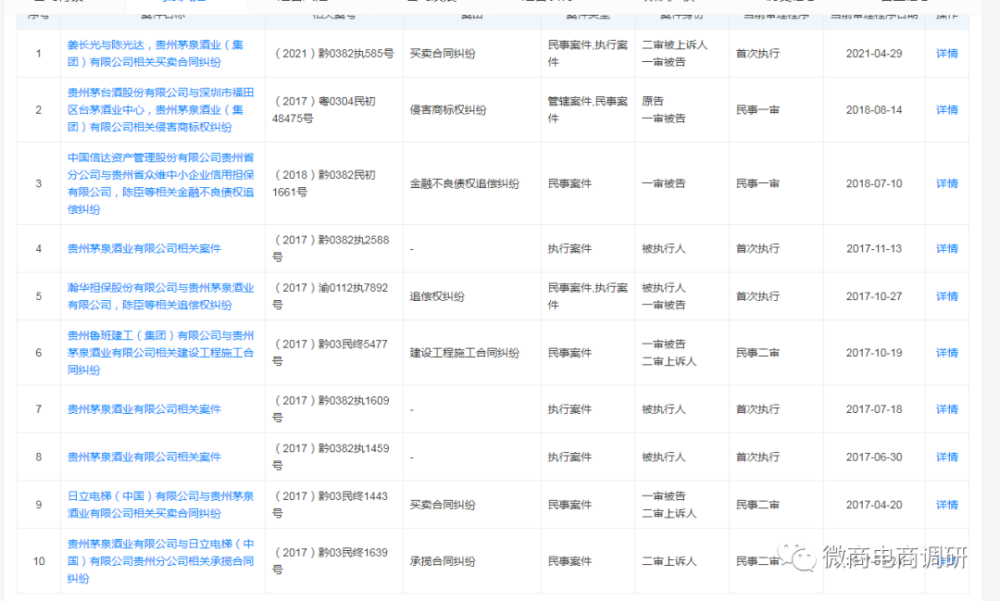 2016年到2017年,茅泉酒业公司五度被贵州省仁怀市人民法院列为失信被执行人。2017年4月,茅泉酒业因拒不支付给日立电梯(中国)有限公司的53700元电梯安装尾款而被诉至法院,同月又因拖欠瀚华担保股份有限公司4103085.75元被法院列为执行人。2017年7月,茅泉酒业因拖欠鲁班建工有限公司工程款844963元拒不付款而被诉至法院。2018年3月,茅泉酒业因拖欠中国信达资产管理股份有限公司贵州省分公司683.41万元贷款而被诉至法院。