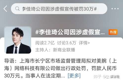 2021年8月13日,微博话题“李佳琦公司因涉虚假宣传被罚30万”冲上热搜。