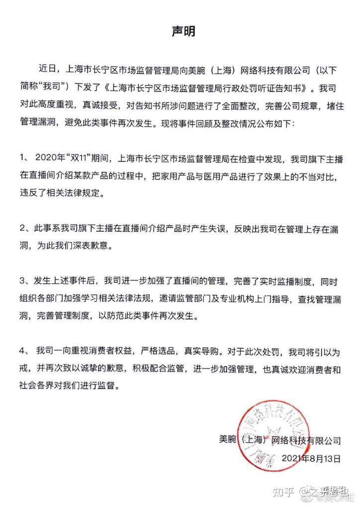 8月13日,美腕公司发布声明表示,将对所涉问题全面整改,避免发生此类事件。并表示,此事系美腕公司旗下主播在直播间介绍产品时产生失误,反映出公司在管理上存在漏洞,为此深表歉意。