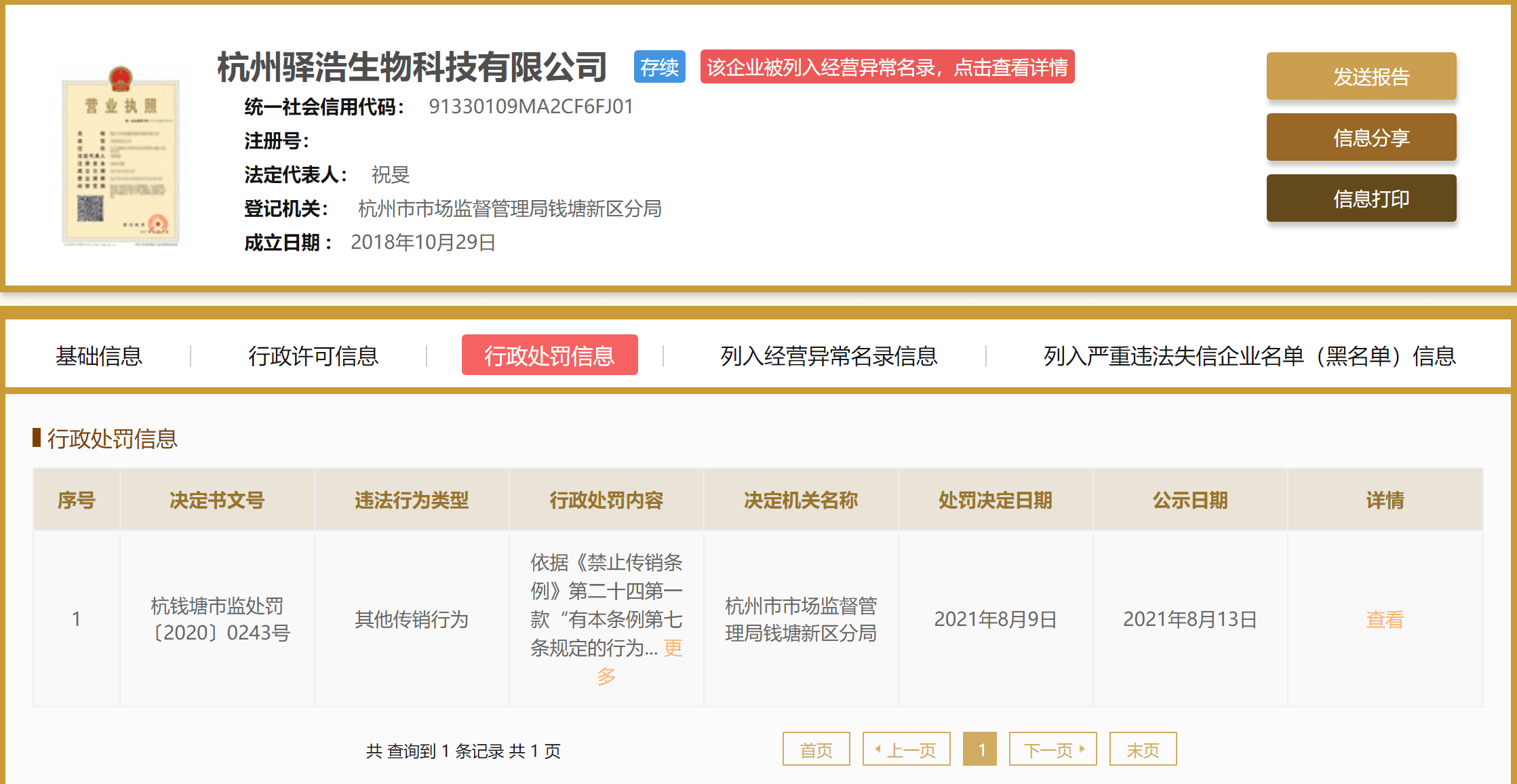 近日,据国家企业信用信息公示系统显示,杭州驿浩生物科技有限公司“其他传销行为”被杭州市市场监督管理局钱塘新区分局处罚50万元。