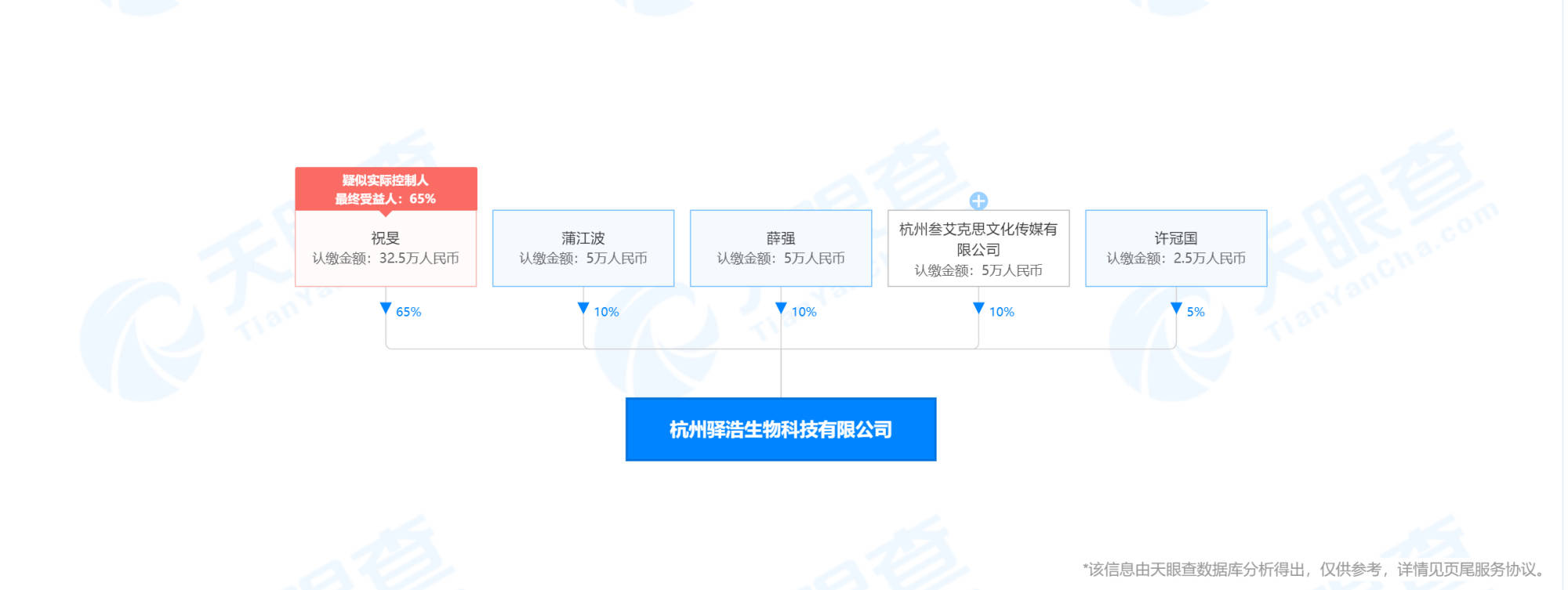 据天眼查APP显示,杭州驿浩生物科技有限公司成立于2018年10月29日,注册资本 为50万,法定代表人是祝旻,持股65%,薛强持股10%,蒲江波持股10%,杭州叁艾克思文化传媒有限公司持股10%,许冠国持股5%。其官网微博名为“YIHOO口腔美学大师”。
