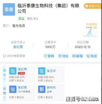 据了解,爱康菲是临沂泰康生物科技(集团)有限公司旗下的品牌,也就是经销商所说的泰康集团,该公司于2020年12月15日成立,注册资本1000万元,实缴不详,法定代表人张红雨占股份70%,为公司执行董事兼总经理,张玉华占股份30%目前该公司经营着爱康菲的官网和名为“爱康菲大健康”的公众号。