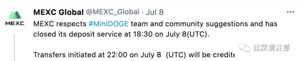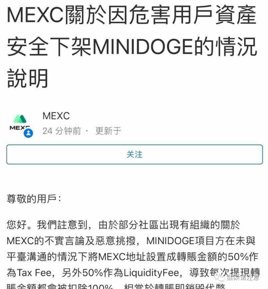公告称,MEXC因危害用户资产安全下架MiniDoge,并指出部分社区出现有组织的关于MEXC的不实言论和恶意挑拨。