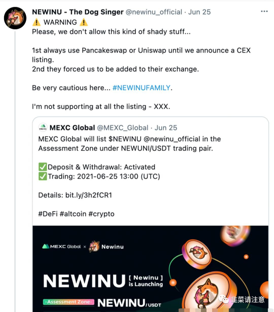 6月25日,NewInu社交账号指出,未申请在抹茶交易所等中心化交易所发行NewInu,表示反对该灰色行为,并警示用户注意。