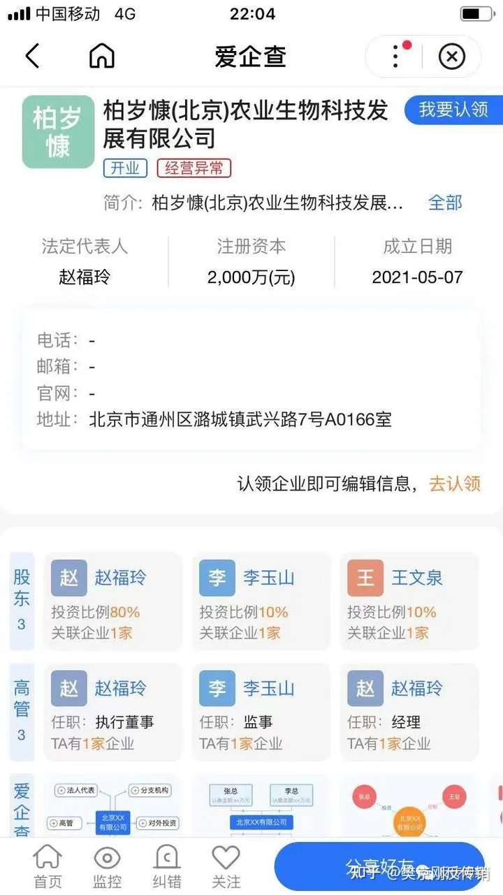 据了解柏岁慷(北京)农业生物科技发展有限公司成立于2021年5月7日,法定代表人为赵福玲,注册资本为2000万元人民币。其产品柏岁慷宣传可以包治百病、针对医界难题的新冠病毒、艾滋病毒、流感病毒、乙肝病毒都不在话下,可所谓灵丹妙药。其可夸张到对于癌症晚期的患者服用几个月后即可恢复。不过通过爱企查来看这家公司刚成立三个月就经营异常。