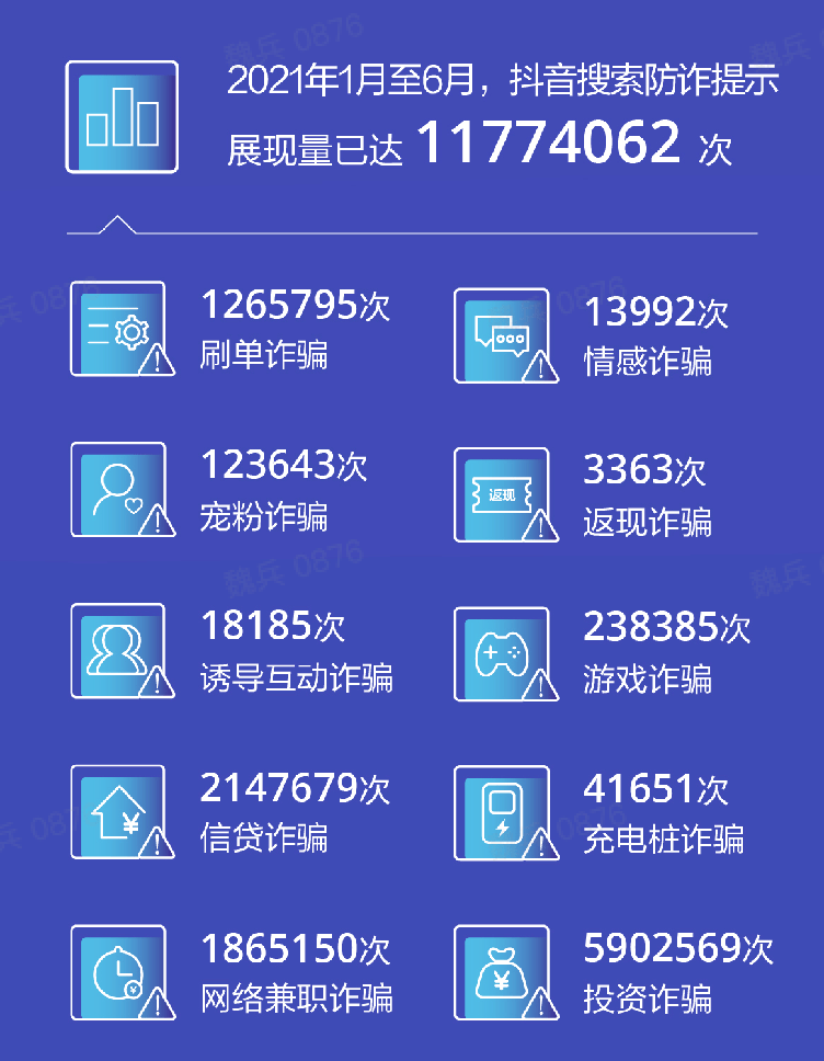 8月18日,抖音发布《抖音网络诈骗打击治理报告(2021年1月至6月)》(以下简称“报告”)。报告显示,2021年1月至6月,抖音安全中心主动封禁涉嫌诈骗帐号超过80万个,拦截下架涉嫌诈骗视频内容超过100万条。同时,抖音安全中心与多地警方联动,落地打击网络诈骗团伙57个,抓获诈骗分子273人。