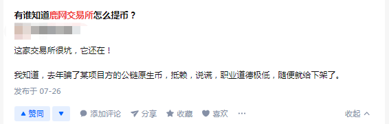 说到底,有关鹿网交易所的负面消息其实早在前面一段时间就被别人曝光过了,你以为你的交易遇到问题只是偶然,但实际在这个交易所提现遇到问题是必然结局。