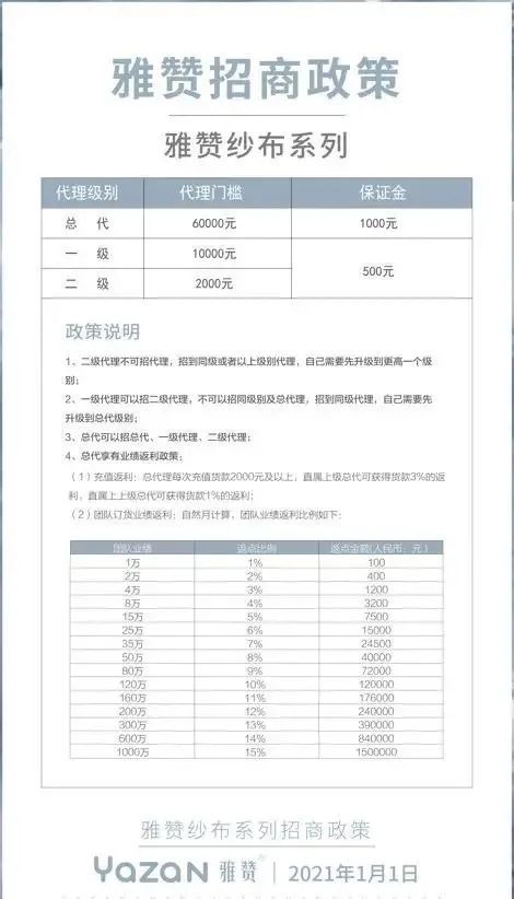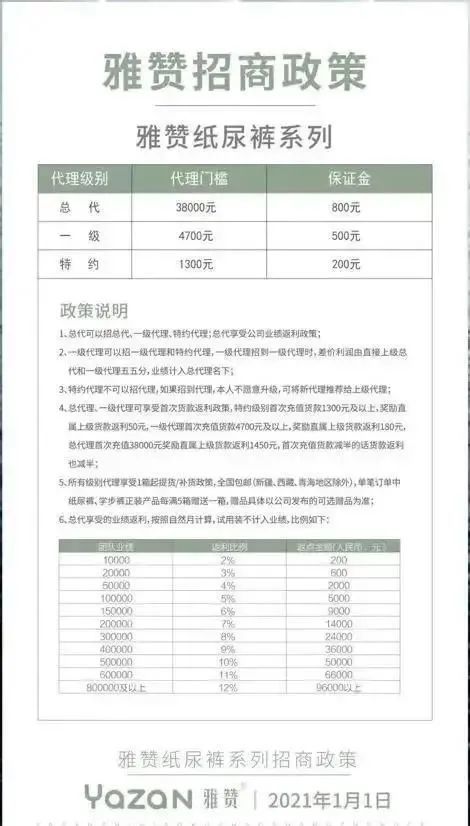其中雅赞纱布系列代理主要分为三级,分别是总代、一级、二级,代理门槛分别为6万元、1万元、2千元,而总代需要缴纳保证金1千元,一级和二级代理需要缴纳500元保证金。