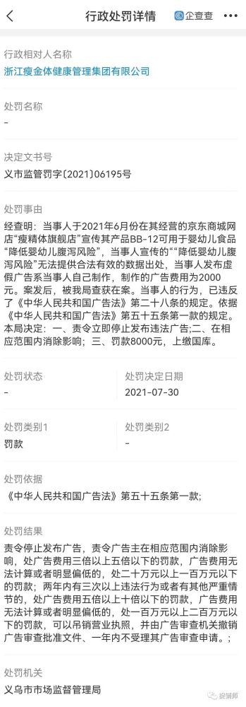 根据决定文书号为义市监管罚字﹝2021﹞06195号,处罚日期为2021-07-30的处罚决定书显示,经查明:当事人于2021年6月份在其经营的京东商城网店“瘦精体旗舰店”宣传其产品BB-12可用于婴幼儿食品“降低婴幼儿腹泻风险”,当事人宣传的““降低婴幼儿腹泻风险”无法提供合法有效的数据出处,当事人发布虚假广告系当事人自己制作,制作的广告费用为2000元。案发后,被我局查获在案。当事人的行为,已违反了《中华人民共和国广告法》第二十八条的规定。依据《中华人民共和国广告法》第五十五条第一款的规定。本局决定:一、责令立即停止发布违法广告;二、在相应范围内消除影响;三、罚款8000元,上缴国库。