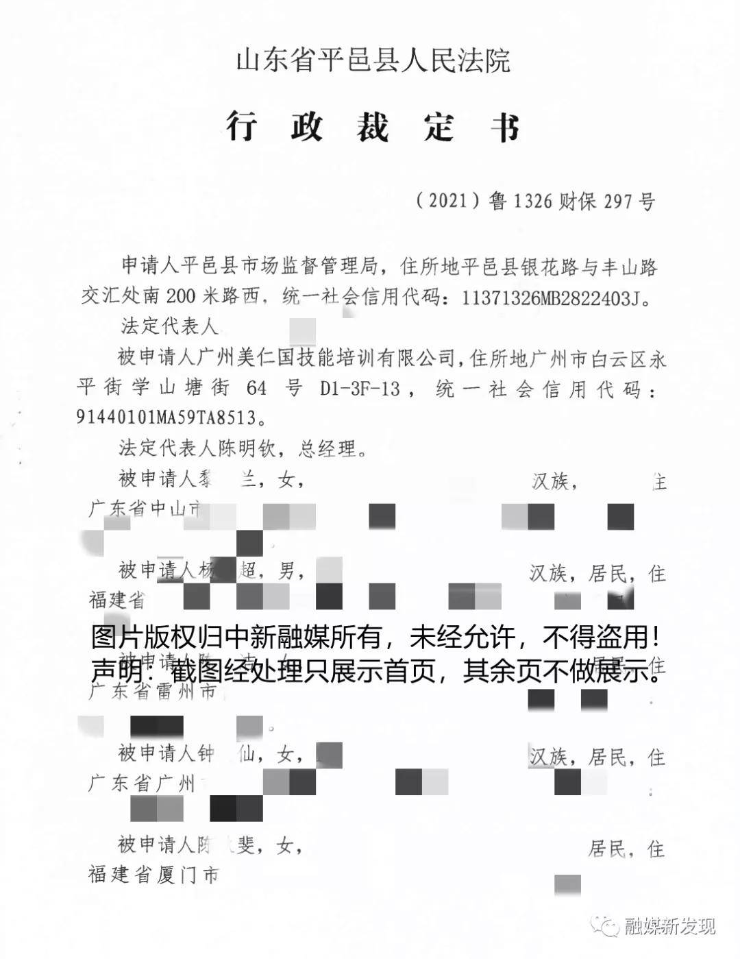 据悉,为防止被申请人转移或者隐匿违法资金,2021 年 6月 11 日,平邑县市场监督管理局向当地人民法院提出申请,要求冻结被申请人广州美仁国技能培训有限公司、 杨某超、陈某洁、刘某娇、张某然、李某飞、钟某仙、陈某斐、陈某锋、余某强、黎某兰、戴某芳、杨某雁在金融机构的银行账户存款。