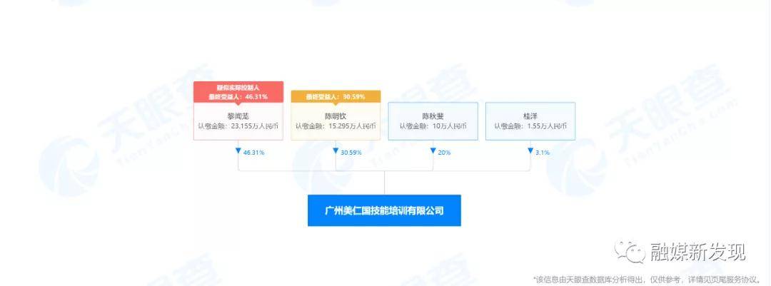 据天眼查APP显示,美仁国公司成立于2017年8月25日,注册资本为50万元,陈明钦担任法人,持股30.59%,陈秋斐持股20%,黎闻茏持股46.31%,桂洋持股3.1%。