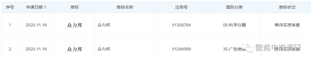 该公司所申请的关于“众力邦”的商标都还处于“等待实质审查”的阶段。