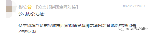 值得注意的是,该公司的注册地址是辽宁省葫芦岛市连山区抚民街3-17号楼4单元601室(官网地址显示的也是如此),而在推广人员“彬总”的口中,该公司的办公地址为辽宁省葫芦岛市兴城市四家街道泉海御龙湾网红基地新东路60号2号楼303,这两者间的描述明显存在出入。目前,厚勇名下还有一家企业,其名为众邦(辽宁)网络科技有限公司,该公司成立于2021年2月7日,注册地址在辽宁省葫芦岛市龙港区碧桂园御珑府10#楼1单元1层H号,和推广人员口中的地址同样也并不相符。