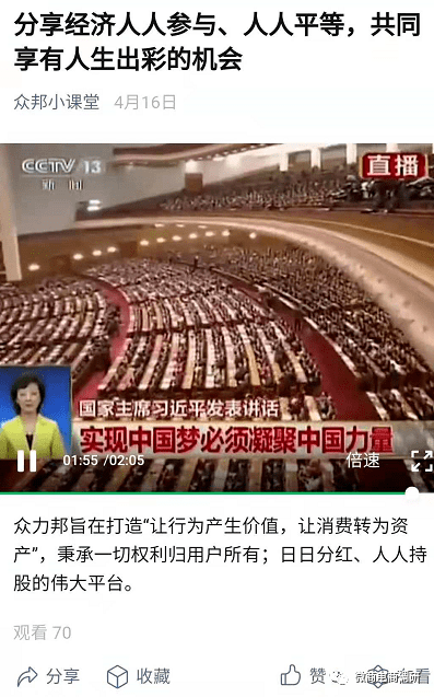 为了进一步推广众力邦这个项目,众邦公司所认证的官方公众号“众邦小课堂”还在一篇宣传文章中附上了国家领导人讲话的视频。根据我国《广告法》第九条第二项的规定,广告不得使用或者变相使用国家机关、国家机关工作人员的名义或者形象。