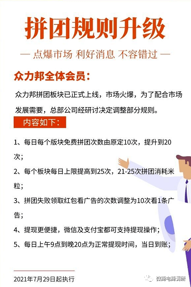 2021年7月29日,众力邦官方还对拼团规则进行了一次调整。