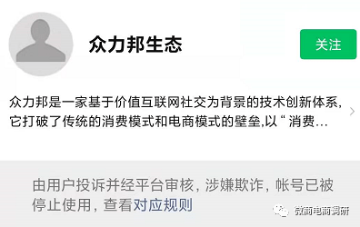 除了“众邦小课堂”之外,由众邦公司认证的另外一个官方公众号“众力邦生态”也已因由用户投诉并经平台审核,涉嫌欺诈,其账号已被停止使用。