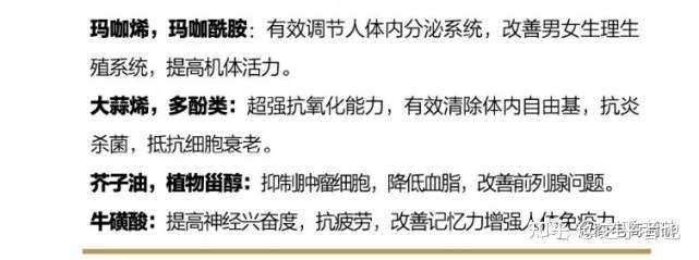 据官方公众号宣传,该款产品的成分大蒜烯、多酚类、牛磺酸等也被包装为具有超强抗氧化能力,并且能够抗疲劳、改善记忆力、增强免疫力,该产品所含有的另一些成分如芥子油、植物甾醇等,甚至被宣称为能够抑制肿瘤细胞和降血脂、改善前列腺问题。