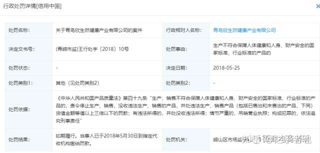 说到产品质量,新时家智能科技有限公司在2019年(青岛欣生然健康产业有限公司未更名时期)还曾因生产不符合保障人体健康和人身、财产安全的国家标准、行业标准的产品,遭到了当地市场监督管理局的处罚。